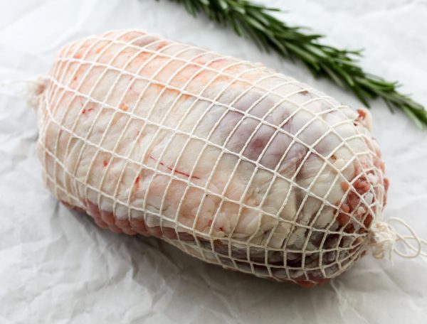 Het lamsbout, ontbeend, opgerold en opgebonden: helemaal klaar om gebraden te worden. Mist het been dat extra smaak aan het vlees geeft, maar daar tegenover staat de handzame vorm die een gelijkmatige garing mogelijk maakt, en die het gebraad goed laat trancheren. Boutvlees is mager, en behoort dus mooi rosé te blijven.